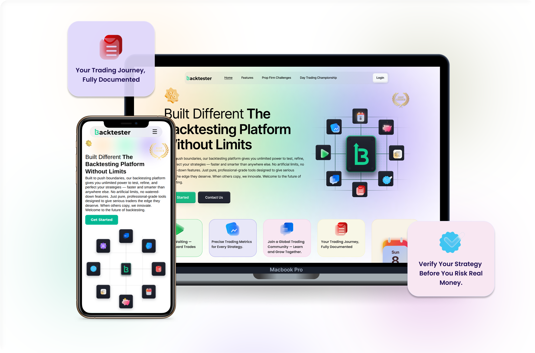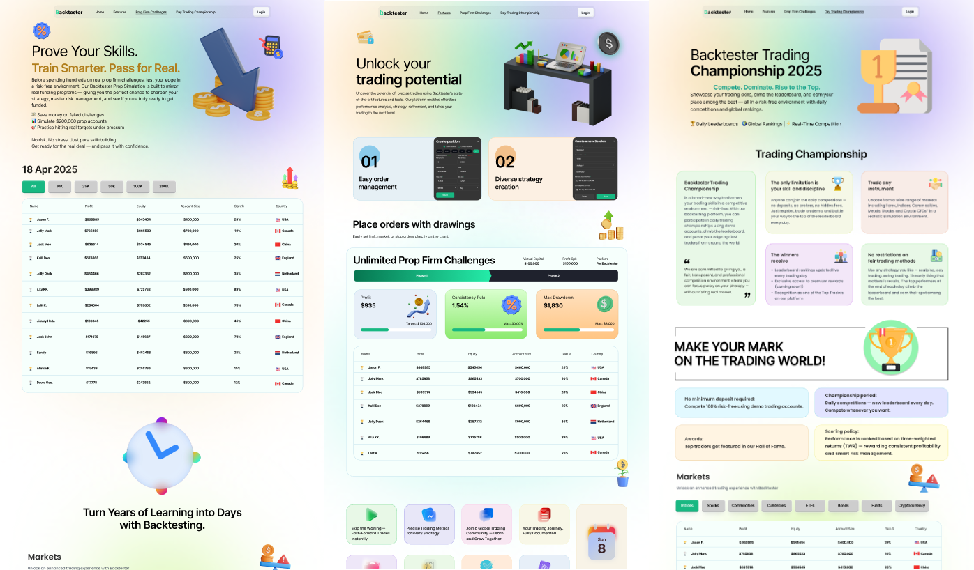 The project involved designing four visually engaging landing page concepts for a modern backtesting and trading analytics platform. Each layout focuses on showcasing the platform’s features such as trading performance stats, prop firm challenges, backtesting tools, analytics, and community engagement while maintaining a clean and trustworthy financial-tech aesthetic. The goal was to provide strong marketing-focused pages that convert visitors into users.